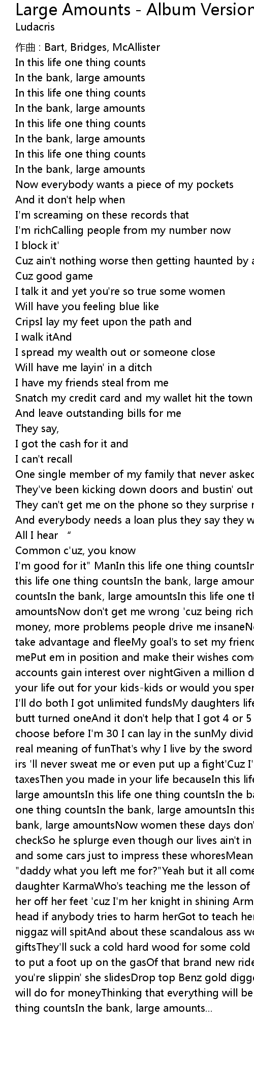 | I'm good for it" ManIn this life one thing countsIn the bank, large amountsIn this life one thing countsIn the bank, large amountsIn this life one thing countsIn the bank, large amountsIn this life one thing countsIn the bank, large amountsNow don't get me wrong 'cuz being rich is such a beautiful thingBut more money, more problems people drive me insaneNot giving no handouts no more so take advantage and fleeMy goal's to set my friends up to make some paper like mePut em in position and make their wishes come trueSo they can have multiple accounts gain interest over nightGiven a million dollars, what you gone do?Map your life out for your kids-kids or would you spend it over night?Now see me I'll do both I got unlimited fundsMy daughters life was set before her stankin' butt turned oneAnd it don't help that I got 4 or 5 retirement fundsSo if I choose before I'm 30 I can lay in the sunMy dividends can show and prove the real meaning of funThat's why I live by the sword but you can die by my gunThe irs 'll never sweat me or even put up a fight'Cuz I'm sure I'll pay more in taxesThen you made in your life becauseIn this life one thing countsIn the bank, large amountsIn this life one thing countsIn the bank, large amountsIn this life one thing countsIn the bank, large amountsIn this life one thing countsIn the bank, large amountsNow women these days don't want a man without a nice pay checkSo he splurge even though our lives ain't in right place yetBuying jewelery and some cars just to impress these whoresMean while you child's poor like "daddy what you left me for?"Yeah but it all comes back that's why I named my daughter KarmaWho's teaching me the lesson of life and making me smarterI sweep her off her feet 'cuz I'm her knight in shining ArmourAnd I have your fucking head if anybody tries to harm herGot to teach her about the game that most of us niggaz will spitAnd about these scandalous ass women that get money through giftsThey'll suck a cold hard wood for some cold hard cashOr ride a brother good to put a foot up on the gasOf that brand new ride, pick up our friendsWhile you're slippin' she slidesDrop top Benz gold diggers insideCrazy what the world will do for moneyThinking that everything will be alright 'cuzIn this life one thing countsIn the bank, large amounts... |