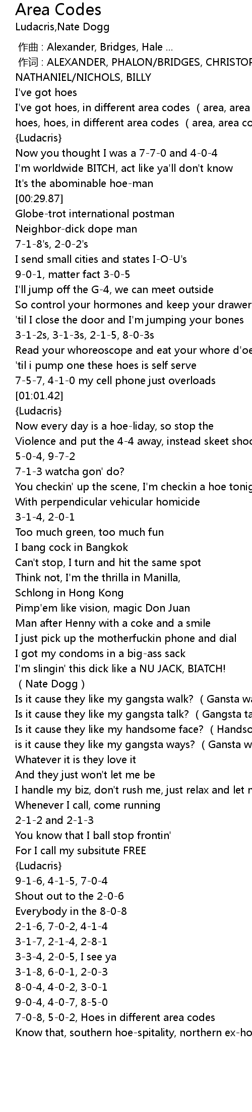 | [00:15.18] | hoes, hoes, in different area codes area, area codes.. codes |