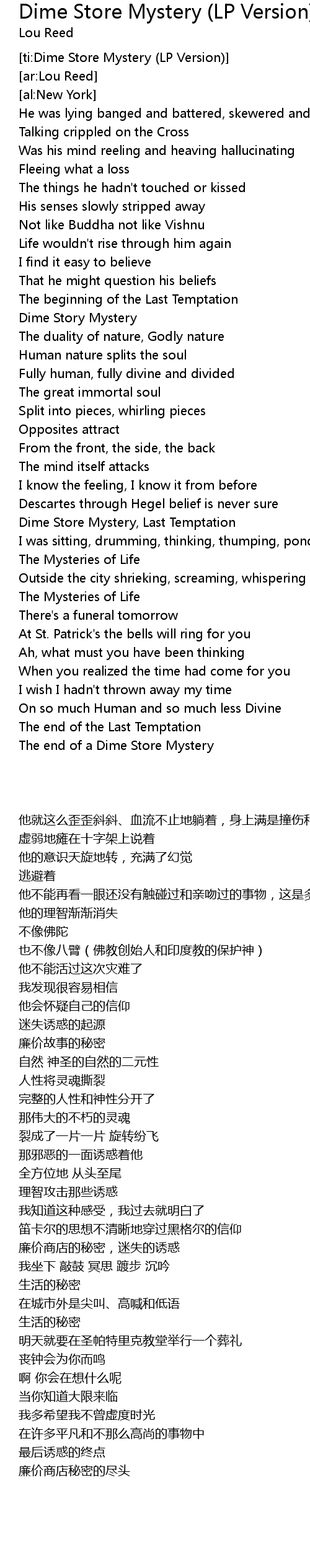 | [02:17.07] | Dime Store Mystery, Last Temptation |
