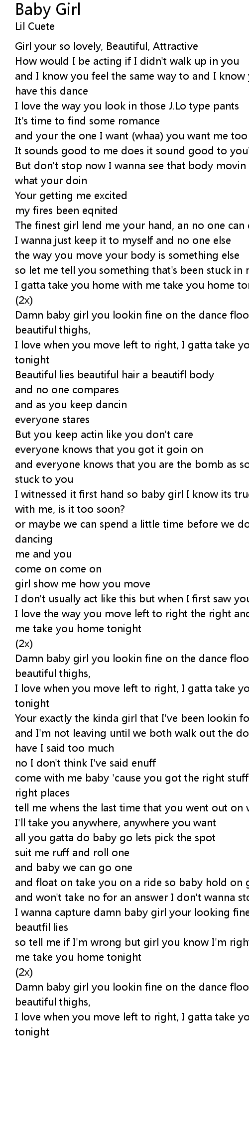 | Damn baby girl you lookin fine on the dance floor with tha beautiful lies, beautiful thighs, | |