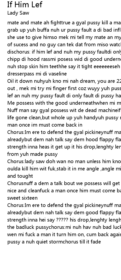 mate and mate ah fighttrue a gyal pussy kill a man last nightbut watch yah gyal grab up yuh buffa nuh ur pussy fault a di bad influence from fi her fuck deh wah she use to give himso mek mi tell my mate an my man seh, mi bornwid di enitial of sucess and no guy can tek dat from miso watch lady saw pon di casewatch dischorus: if him lef and nuh my pussy faultdi only fault mi pussy hav a fi chipp di hood rassmi posess wid di good underneathwen mi man a fuck di pussy him nuh stop skin him teethhe say it tight eeeeeeeseh mi cyaant get in, look pon di dresserpass mi di vaseline |