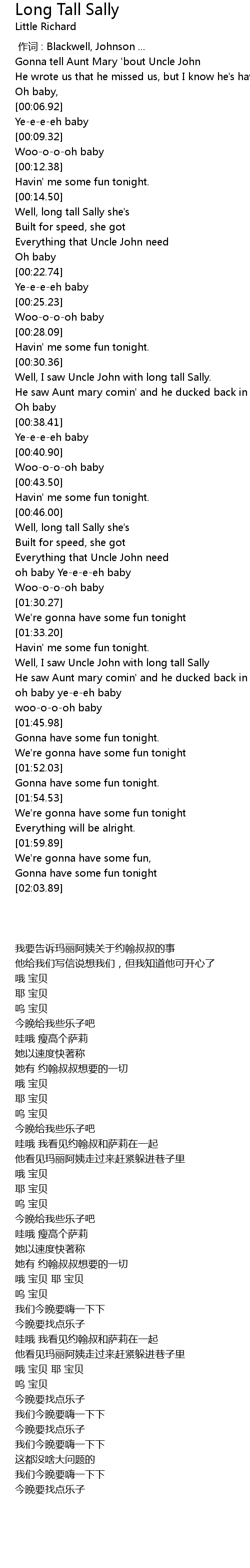 | [01:35.57] | Well, I saw Uncle John with long tall Sally |