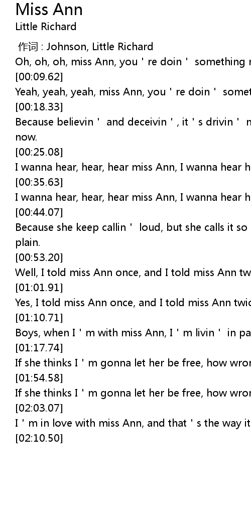 | [00:02.56] | Oh, oh, oh, miss Ann, you're doin' something no-one can, |