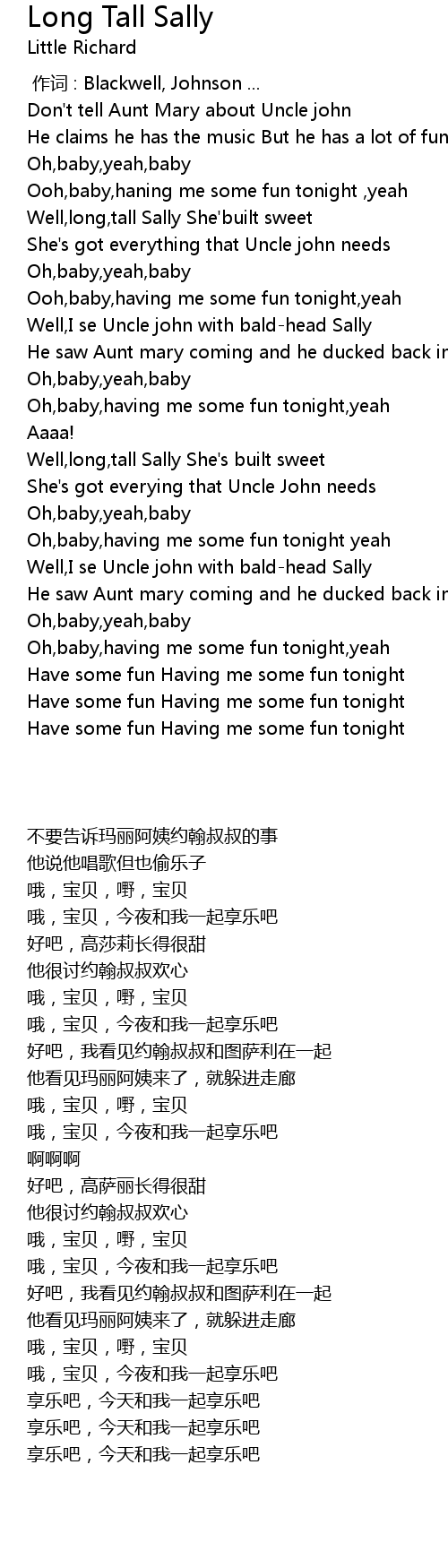| [01:18.938] | Well,long,tall Sally She's built sweet |