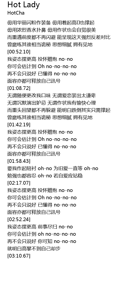 | [00:52.55] | 我姿态摆更高 投怀赠抱 no-no |