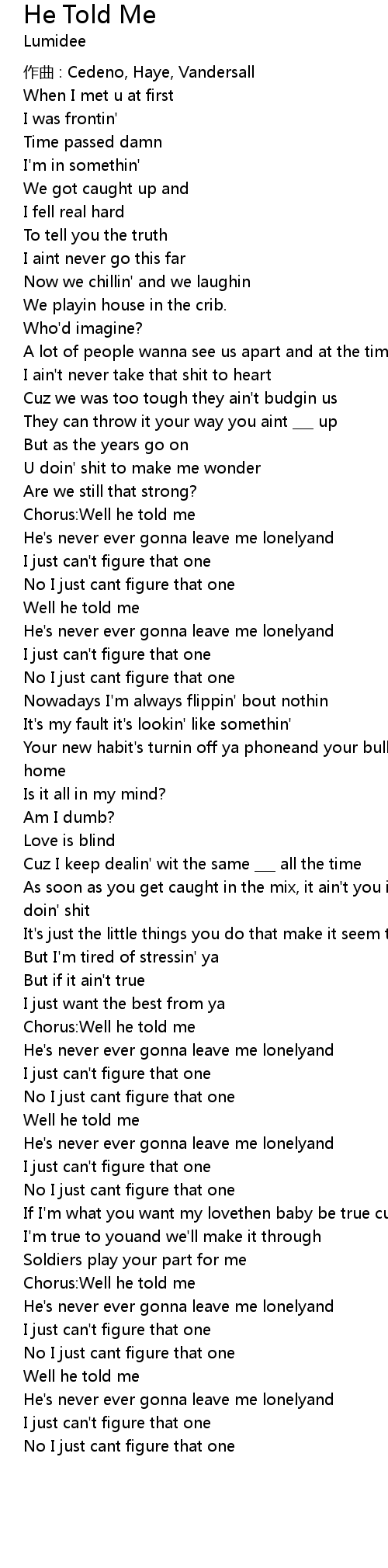 | Your new habit' s turnin off ya phoneand your bull ___ stories when you come back home | |