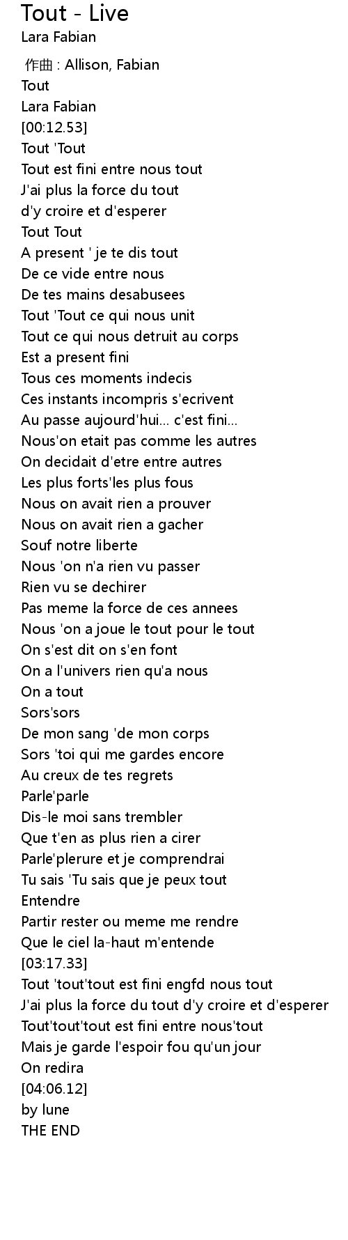 | [03:33.53] | Tout ' tout' tout est fini engfd nous tout |