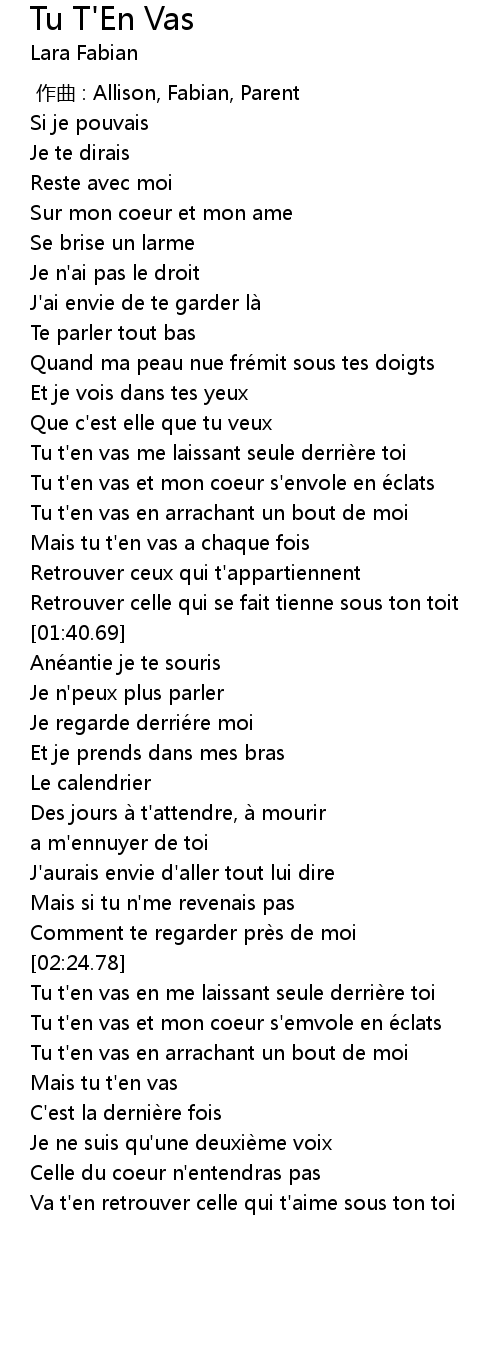 | [02:43.01] | Tu t'en vas en arrachant un bout de moi |