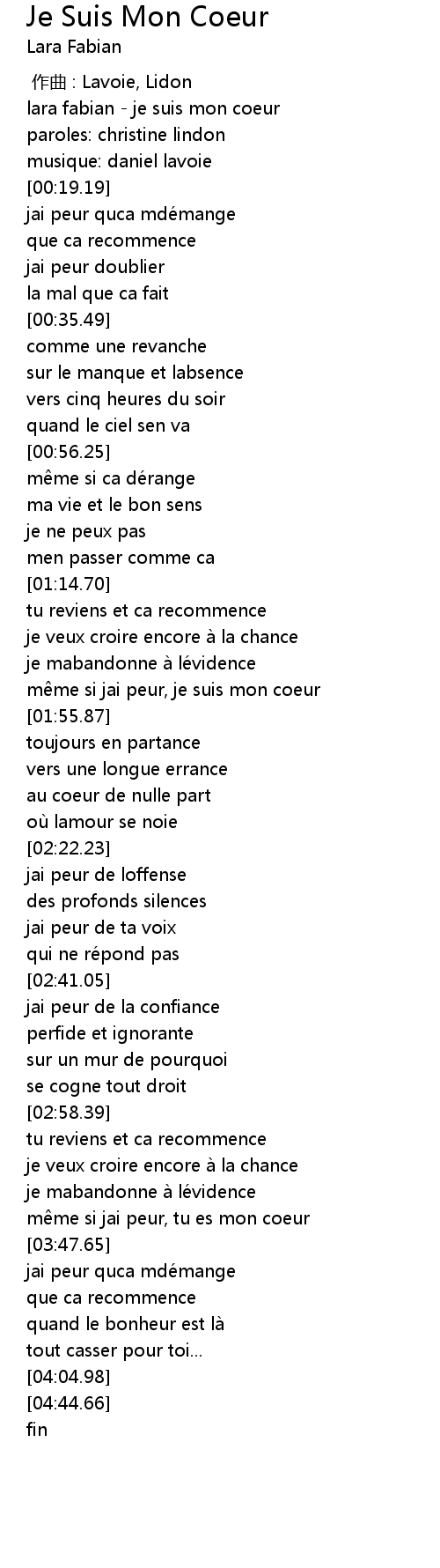 | [03:21.82] | même si jai peur, tu es mon coeur |
