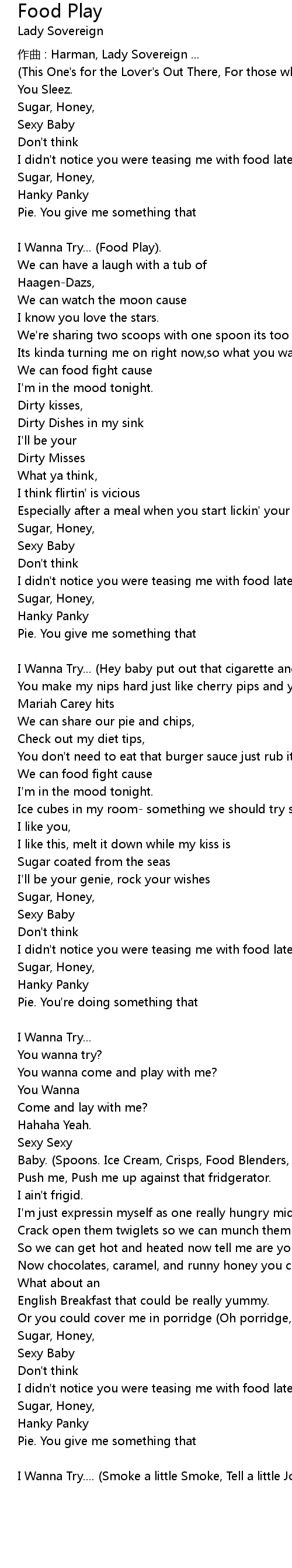 | (This One's for the Lover's Out There, For those who like their food to enhance their mood for love. From the depths of the sea, to the heavens up above. I just love the way Haagen-Dazs drips down your cheek. The way you munch your quarter pounder. Oh my, the way you chew that cheese) | |