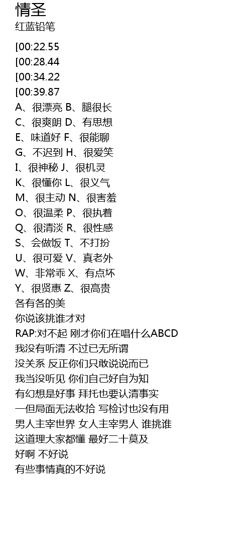 | [01:32.61] | Q、很清淡 R、很性感 |