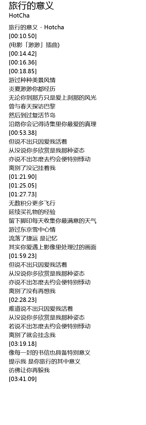 | [00:00.06] | 旅行的意义 - Hotcha |