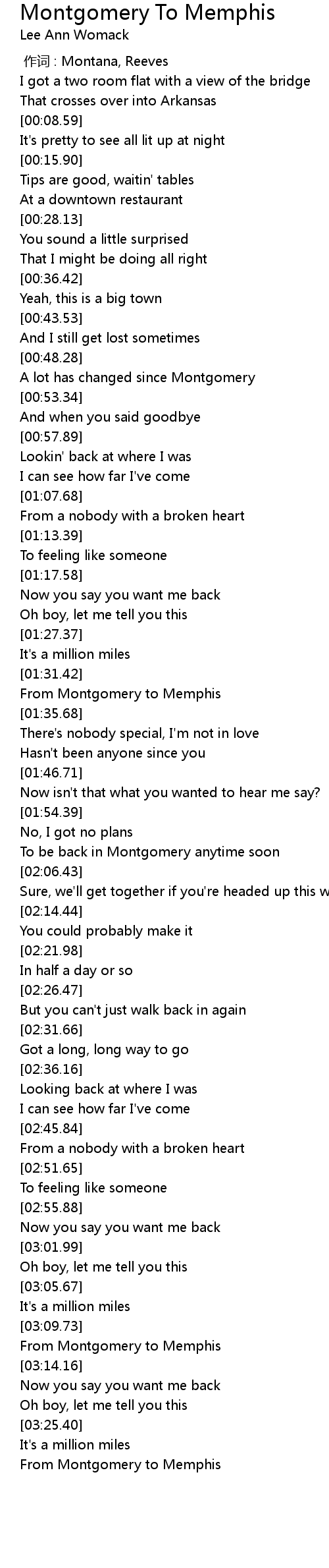 | [02:00.69] | To be back in Montgomery anytime soon |