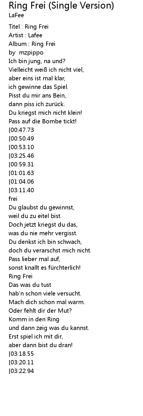 | [03:16.61][03:11.40][03:06.27][03:00.63][02:28.73][02:23.48][01:25.23][01:19.34][01:14.30] | Ring frei |