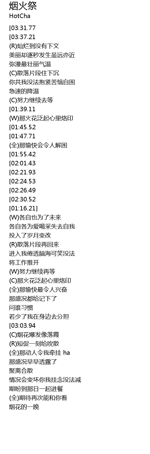 | [00:13.00][03:31.77] | Hotcha-烟火祭(粤) |