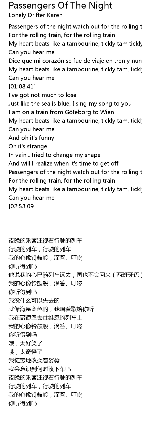 | [02:22.02] | Passengers of the night watch out for the rolling train |