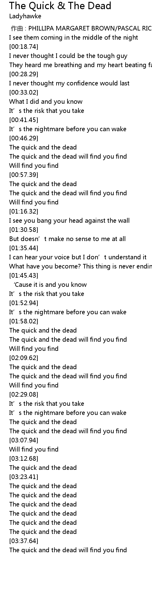 | [03:23.97] | The quick and the dead |