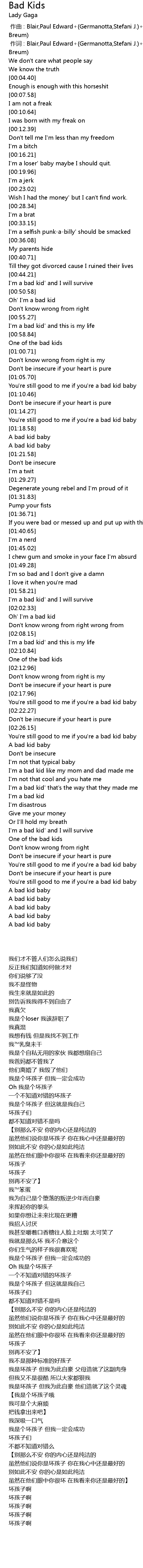 | [00:00.673] | 作词 : Blair,Paul Edward+(Germanotta,Stefani J.)+(Laursen,Jeppe Breum) |