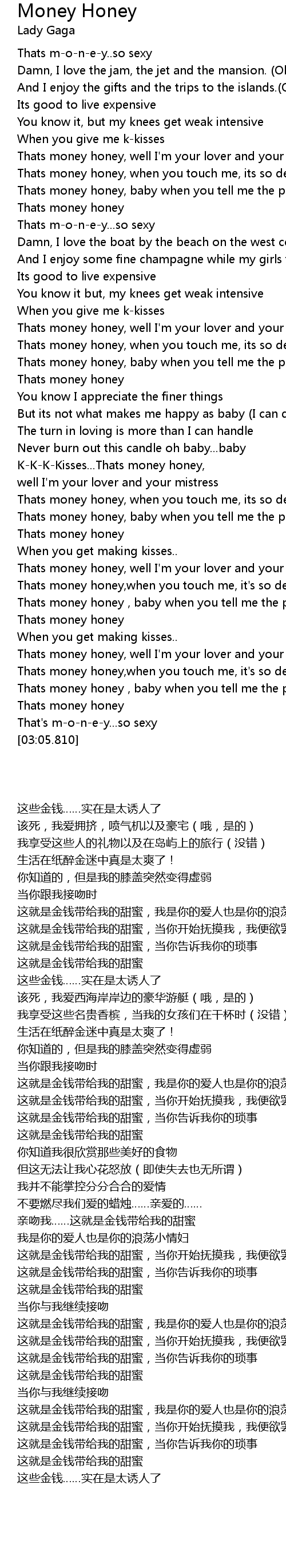 | [02:48.260] | Thats money honey, when you touch me, it' s so delicious |
