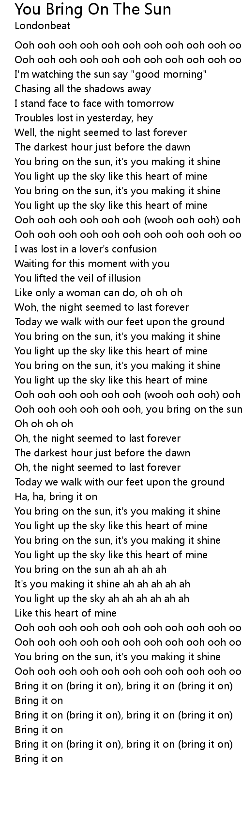 Ooh ooh ooh ooh ooh ooh, you bring on the sun |
