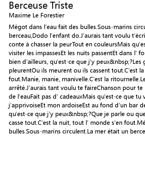 | Me got dans l' eau fait des bulles. Sousmarins circulent. La mer e tait un berceau, Dodo l' enfant do. J' aurais tant voulu t'e crireUn truc a sourire, Un conte a chasser la peurTout en couleursMais qu' estce que tu veux nbsp? Faut visiter les impassesEt les nuits passentEt dans l' fond des bars de Montre alOu bien d' ailleurs, qu' estce que j' y peux nbsp? Les gens boivent ou les gens pleurentOu ils meurent ou ils cassent tout. C' est la nuit, tout l' monde s' en fout. Manie, manie, manivelle. C' est la ritournelle. Le moteur a tout rate, Noye, arr te. J' aurais tant voulu te faireChanson pour te plaire. La rivie re au bord de l' eauFait pas d' cadeauxMais qu' estce que tu veux nbsp? C' est l' angoisse que j' apprivoiseEt mon ardoiseEst au fond d' un bar de Montre alOu bien d' ailleurs, qu' estce que j' y peux nbsp? Que je parle ou que je pleureOu je meure ou je casse tout. C' est la nuit, tout l' monde s' en fout. Me got dans l' eau fait des bulles. Sousmarins circulent. La mer e tait un berceau. Dodo l' enfant do. |