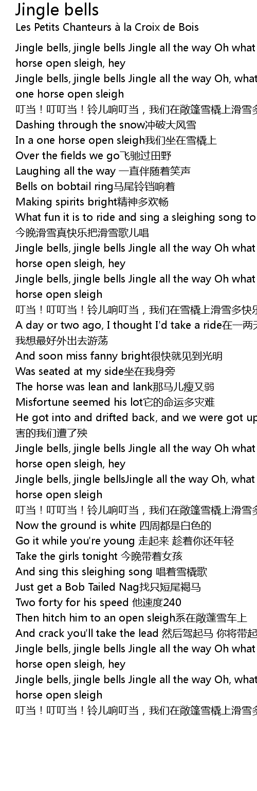 | Jingle bells, jingle bellsJingle all the way Oh, what fun it is to rideIn a one horse open sleigh | |