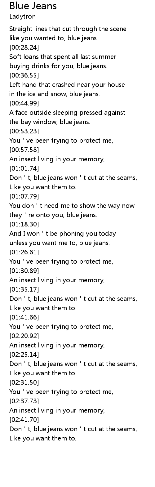 | [01:36.05] | Don't, blue jeans won't cut at the seams, |
