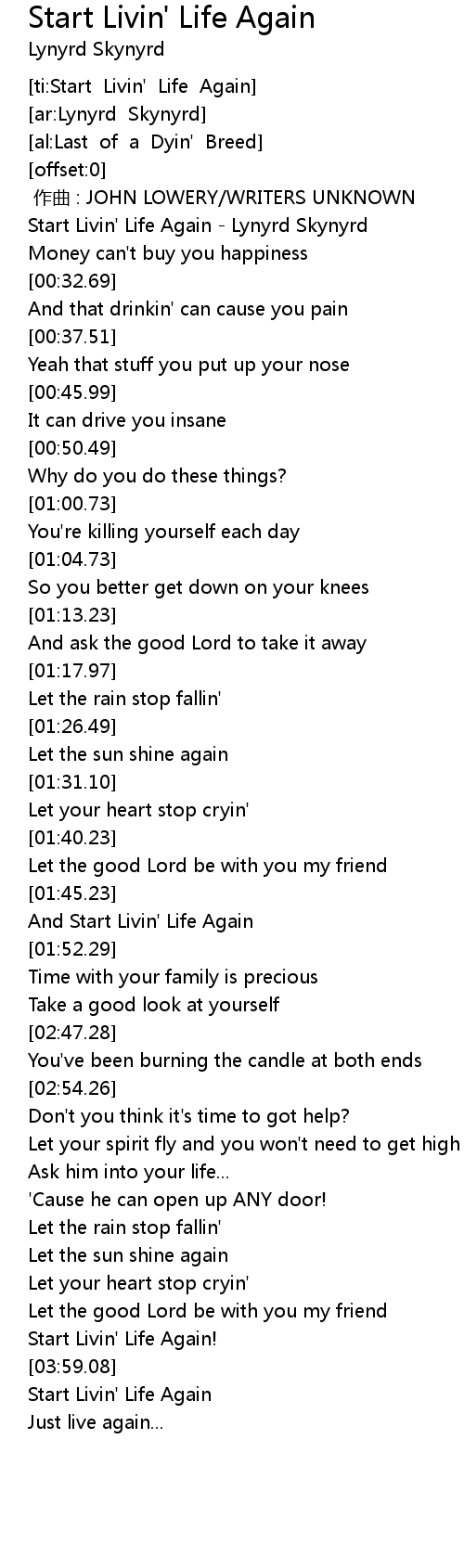 | [00:00.96] | Start Livin' Life Again Lynyrd Skynyrd |