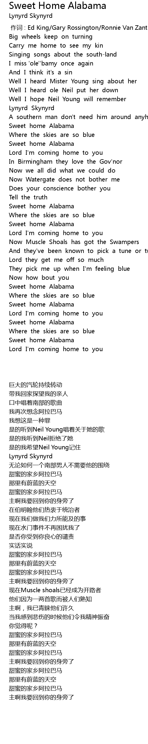 | [01:12.75] | Sweet home Alabama |