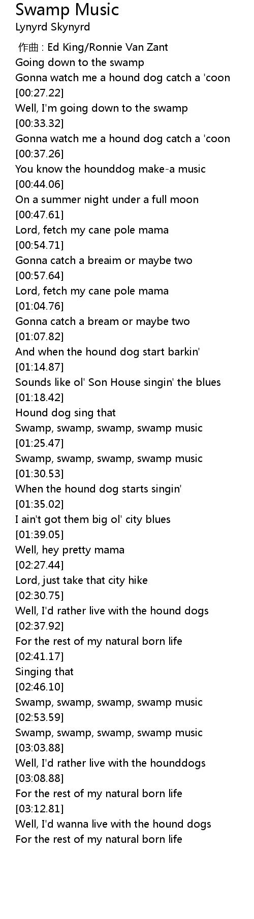 | [03:01.57] | Swamp, swamp, swamp, swamp music |
