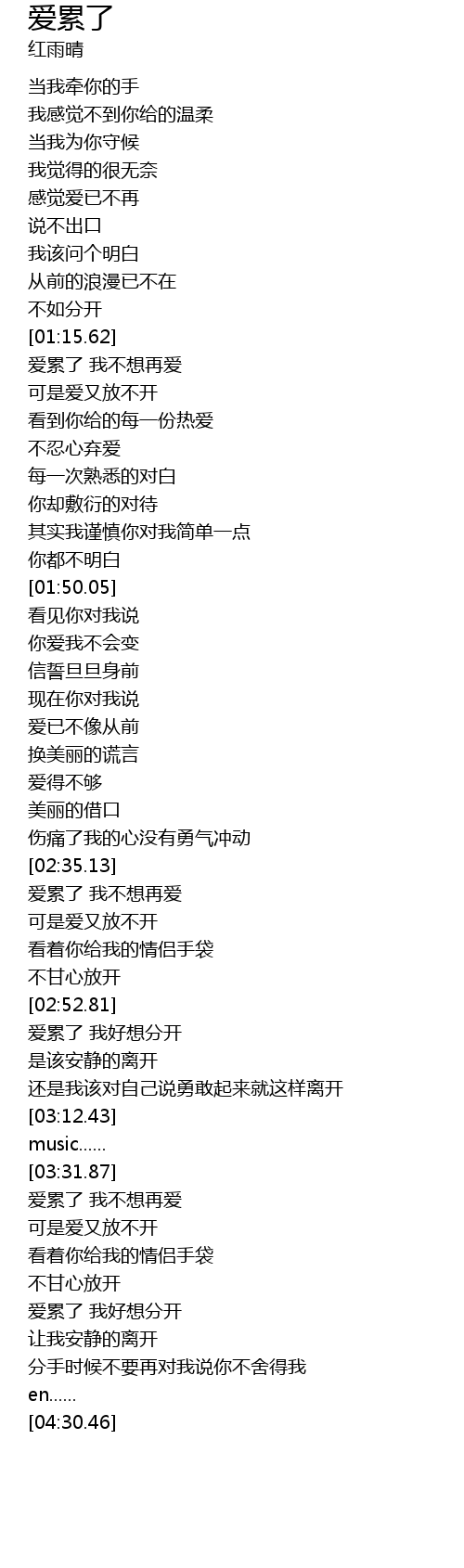 | [01:16.51] | 爱累了 我不想再爱 |