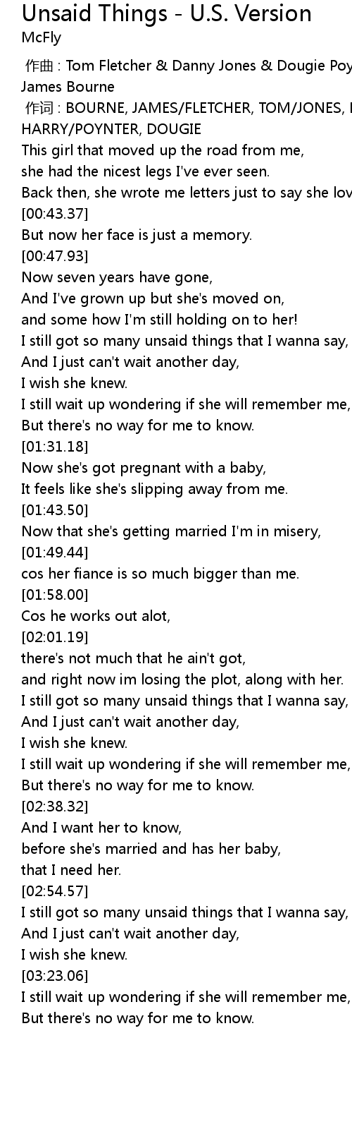 | [00:00.00] | 作曲 : Tom Fletcher & Danny Jones & Dougie Poynter & Harry Judd & James Bourne |