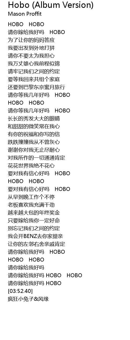 | [02:39.56] | 请你嫁给我好吗 HOBO |