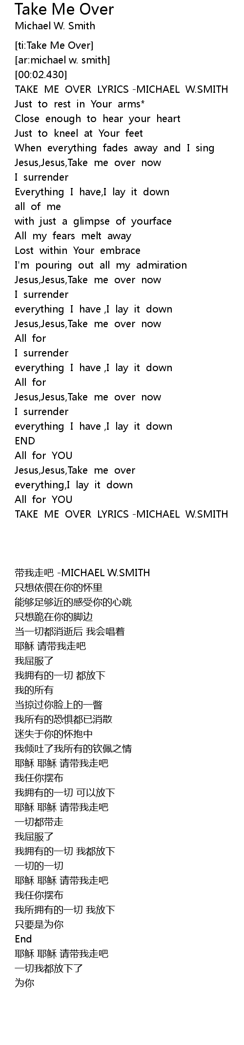TAKE ME OVER LYRICS -MICHAEL W.SMITH |
