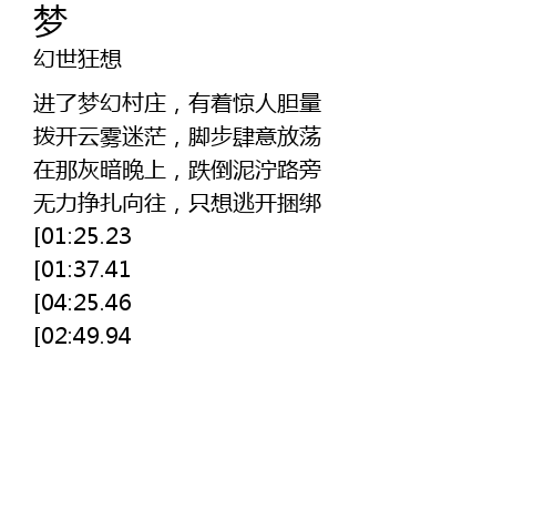 | [03:14.13][02:49.94] | 梦是梦,永远梦乡 梦啊,把我带上,飞向远方 |