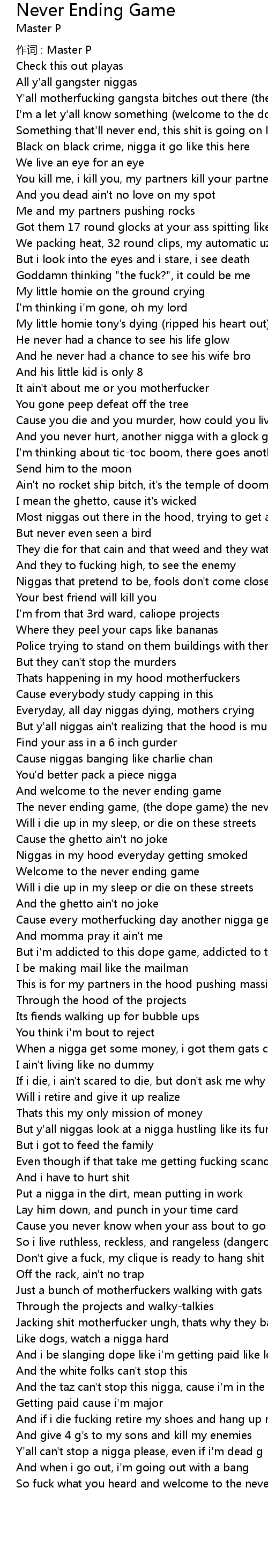 | Something that' ll never end, this shit is going on like fucking numbers | |
