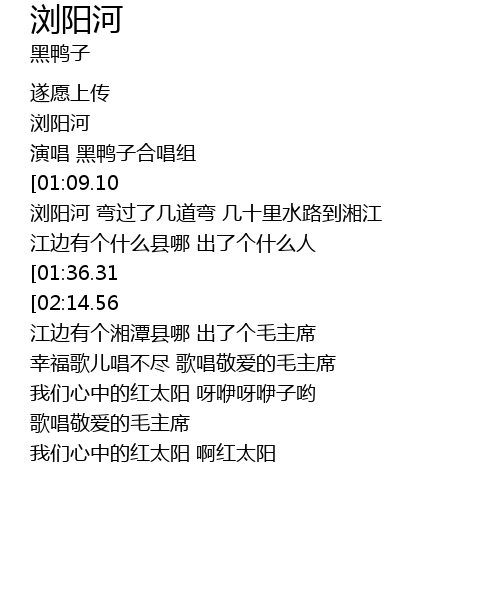 | [01:09.66][02:14.56] | 浏阳河 弯过了九道弯 五十里水路到湘江 |