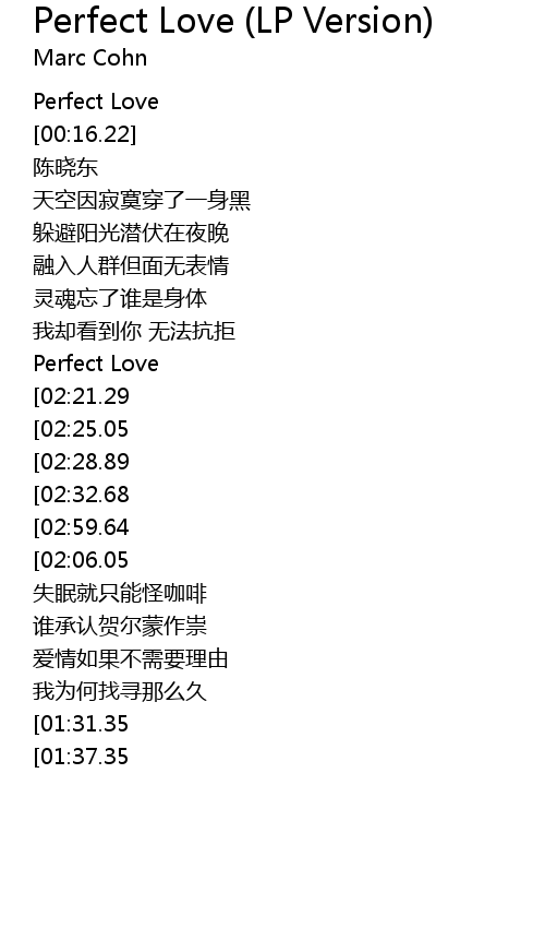 | [03:08.08][02:59.64][02:52.14][01:54.60][01:04.55] | your perfect love |