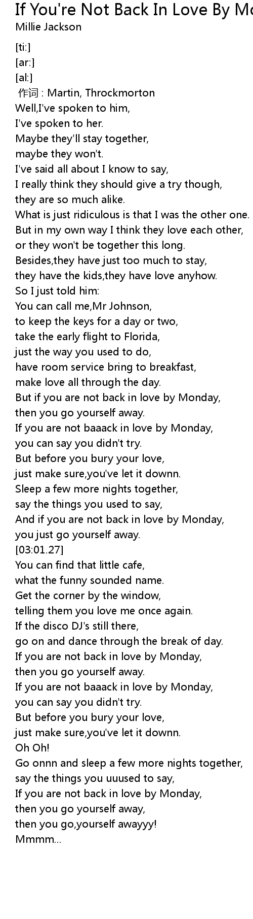 | [02:05.01] | If you are not baaack in love by Monday, |