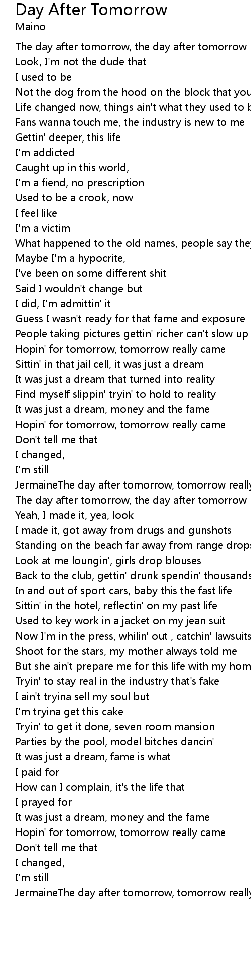 | JermaineThe day after tomorrow, tomorrow really came [x2] |