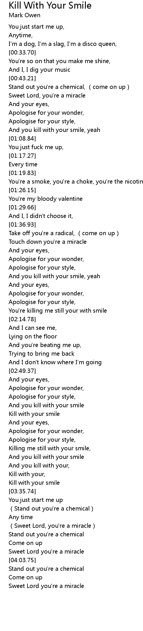 | [01:22.07] | You're a smoke, you're a choke, you're the nicotine, |