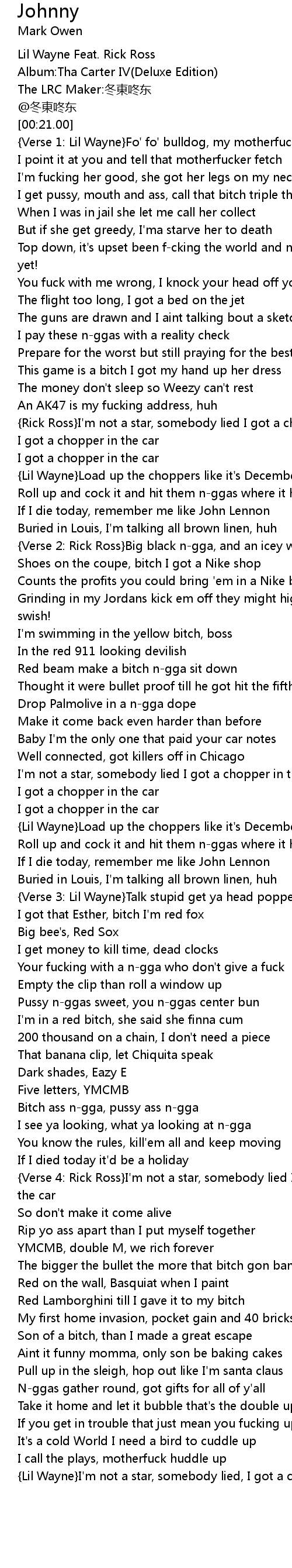 | [00:55.78] | Top down, it's upset been f-cking the world and n-gga and I aint cum yet! |