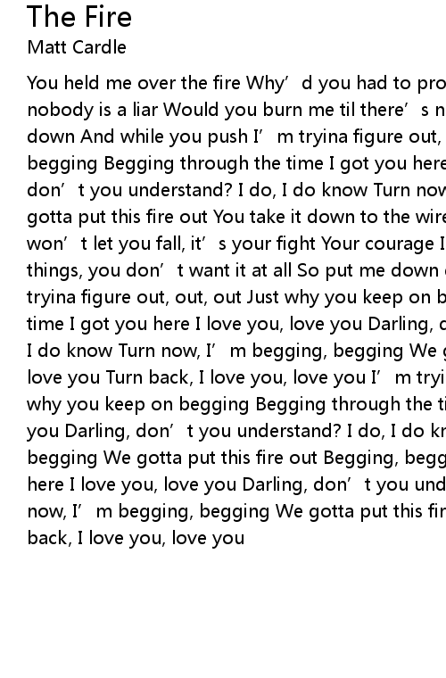 | You held me over the fire Why' d you had to prove it to yourself? I told you nobody is a liar Would you burn me til there' s nothing left? So put me down down And while you push I' m tryina figure out, out, out Just why you keep on begging Begging through the time I got you here I love you, love you Darling, don' t you understand? I do, I do know Turn now, I' m begging, begging We gotta put this fire out You take it down to the wire You won' t surrender but I won' t let you fall, it' s your fight Your courage I admire You got my last things, you don' t want it at all So put me down down And while you push I' m tryina figure out, out, out Just why you keep on begging Begging through the time I got you here I love you, love you Darling, don' t you understand? I do, I do know Turn now, I' m begging, begging We gotta put this fire out Love you, love you Turn back, I love you, love you I' m tryina figure out, out, out Just why you keep on begging Begging through the time I got you here I love you, love you Darling, don' t you understand? I do, I do know Turn now, I' m begging, begging We gotta put this fire out Begging, begging through the time I got you here I love you, love you Darling, don' t you understand? I do, I do know Turn now, I' m begging, begging We gotta put this fire out Love you, love you Turn back, I love you, love you |