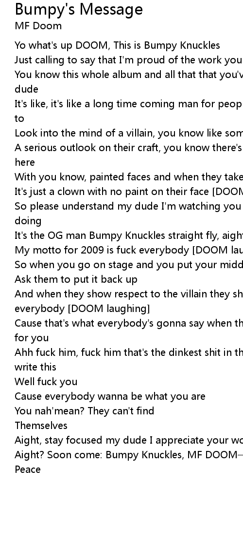 | [00:01.77] | Yo what's up DOOM, This is Bumpy Knuckles |