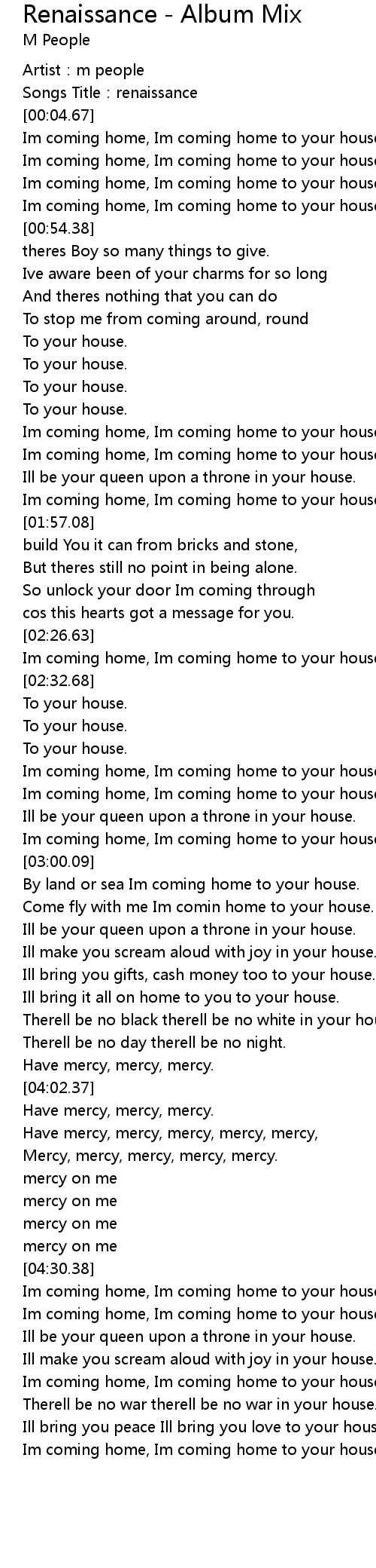 | [04:31.31] | Im coming home, Im coming home to your house. |