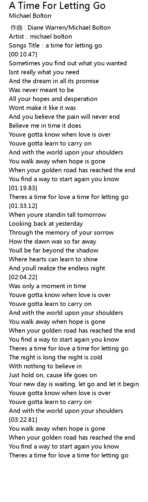 | [01:22.03] | Theres a time for love a time for letting go |