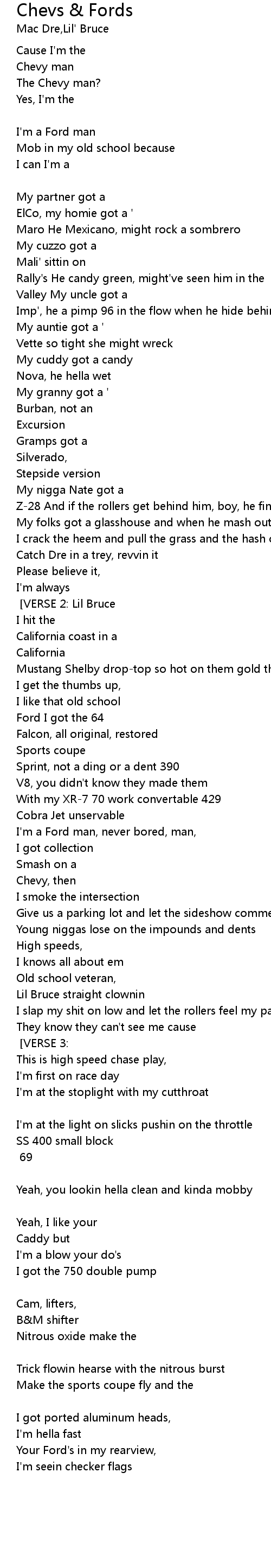 I be the Ford man [CHORUS] [VERSE 3:] [Lil Bruce:] |