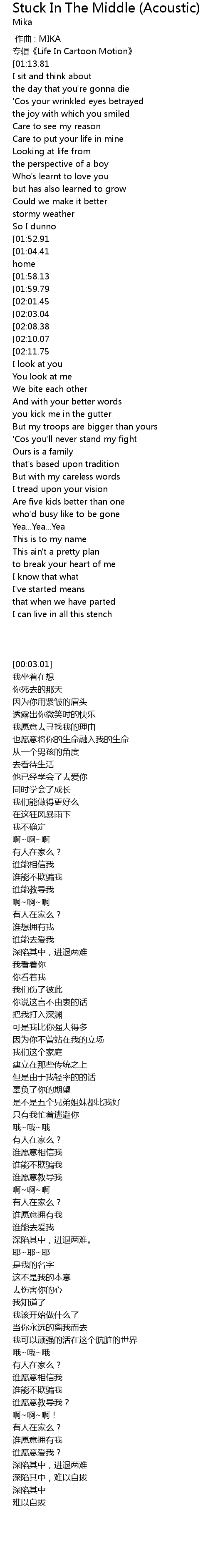 | [01:10.34][02:11.75][03:02.93][03:08.05][03:13.17][03:18.26] | Stuck in the middle |