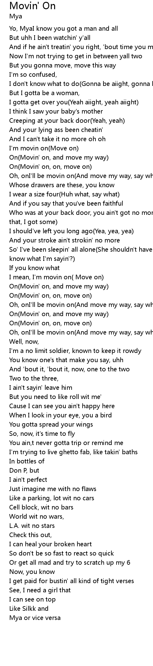 | Oh, onI'll be movin on(And move my way, say what, say what) | |
