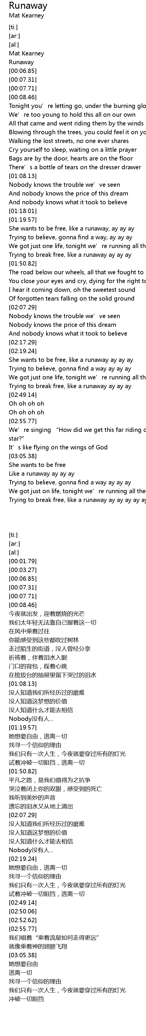 | [02:20.17] | She wants to be free, like a runaway ay ay ay |